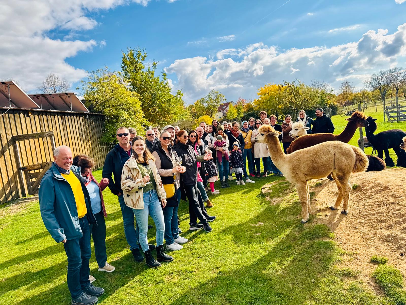 Nach einer kurzen Besichtigung des Weingutes gab es zur Stärkung eine deftige Pfälzer Platte bevor es zur Verkostung der nächsten Weine auf die angrenzende Alpaka-Weide ging. Nicht nur unsere Kleinsten hatten ihren Spaß mit den flauschigen Tieren.