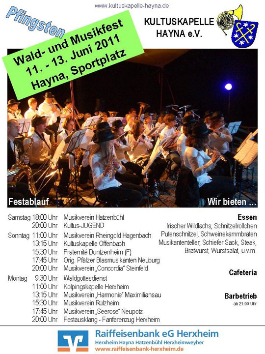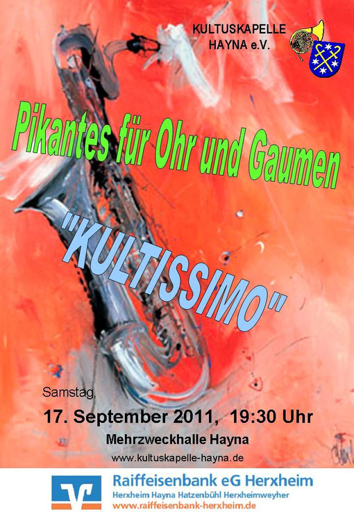 Das vergangene Jahr 2011 war für unsere Kultuskapelle wieder einmal ein sehr ereignisreiches - zahlreiche Aktivitäten wurden veranstaltet und allesamt erfolgreich abgeschlossen: Zu nennen wären hier u.a. das Wald- und Musikfest am Sportplatz, das zahlreiche Gäste aus nah und fern nach Hayna lockte. Im September dann "Kultissimo - ein Erlebnis für Gehör und Gaumen" in der Mehrzweckhalle, oder zum Jahresende die Theaterabende unserer Laienspielgruppe, auch hier war die Mehrzweckhalle an beiden Abenden bestens gefüllt.
