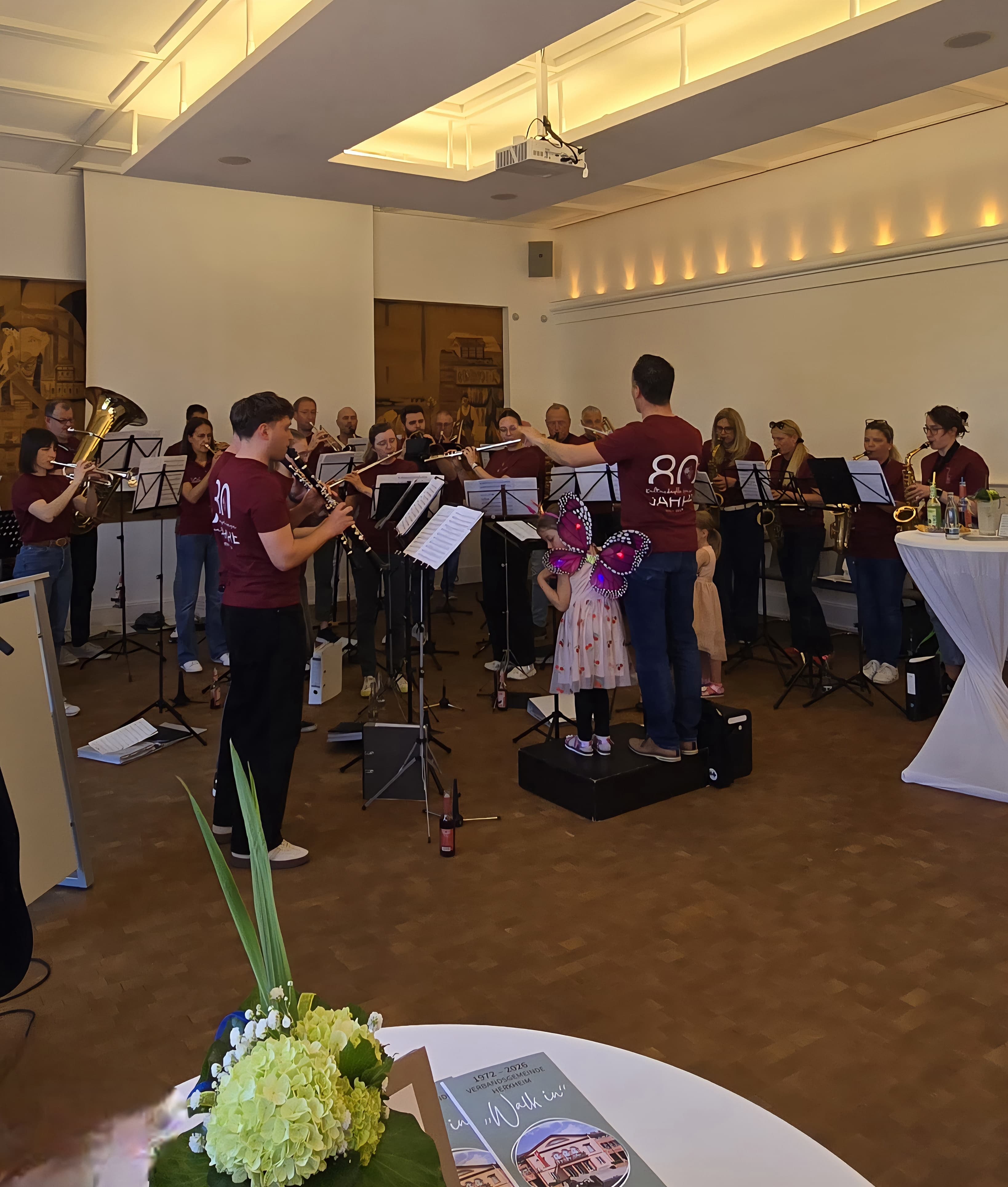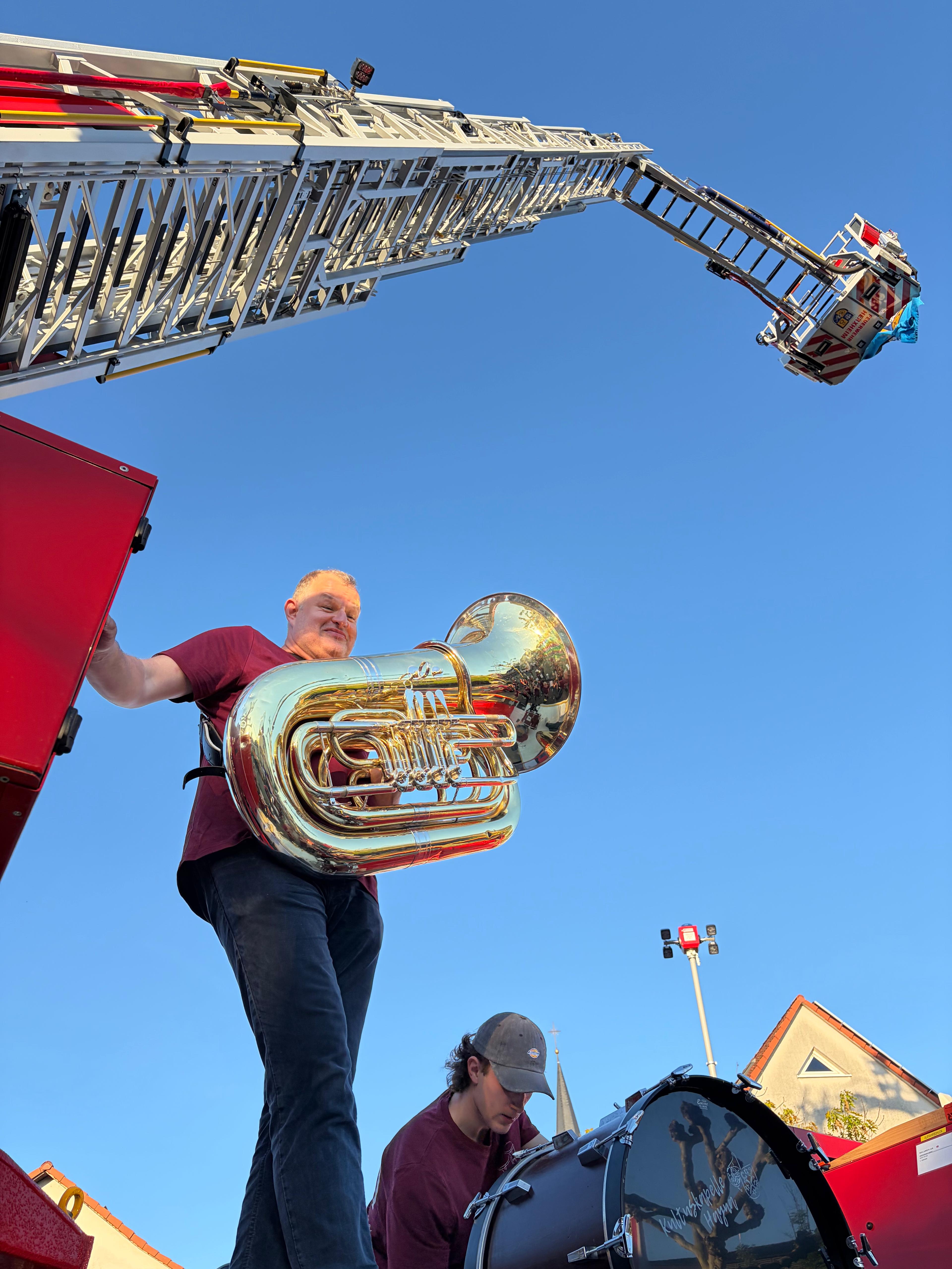 Der klassische Bürgerempfang zum Gründungstag am 23. Mai der Verbandsgemeinde Herxheim wurde heuer durch ein neues Format ersetzt – Kommen zum Schauen und Mitmachen. Auf dem Parkplatz zeigten Bauhof und Feuerwehr eine Fahrzeugschau mit Kehrmaschine, Unimog und Drehleiter. Im Rathaus stellten sich Verbandsgemeinderat, Beigeordnete und Mitarbeitende vor und standen für offene, persönliche Gespräche und Informationen bereit. Im Bühnenprogramm sorgten u. a. die Kultuskapelle Hayna anlässlich ihres 80. Geburtstages für Abwechslung. Gleich viermal spielten die Haynaer: Zur offiziellen Eröffnung im Ratssaal, anschließend für die Kinder Auszüge aus dem anstehenden Konzert „Musikmäuse“ im Juni und zum Abschluss der „Verbandsgemeinde-Party“ gleich zweimal – wieder im Ratssaal mit einem kleinen Platzkonzert und auf speziellen Wunsch der Feuerwehrleute „Die Fischerin vom Bodensee“ draußen neben dem neuen Feuerwehrauto mit Drehleiter. Mit diesem Auftritt startete die Kultuskapelle in ihr 80-jähriges Jubiläumsjahr. Das nächste Highlight im Rahmen der Jubiläumsveranstaltungen ist das traditionelle Waldfest an Pfingsten, gefolgt von einem Kinder- & Jugendtag am 13. Juni 2026.