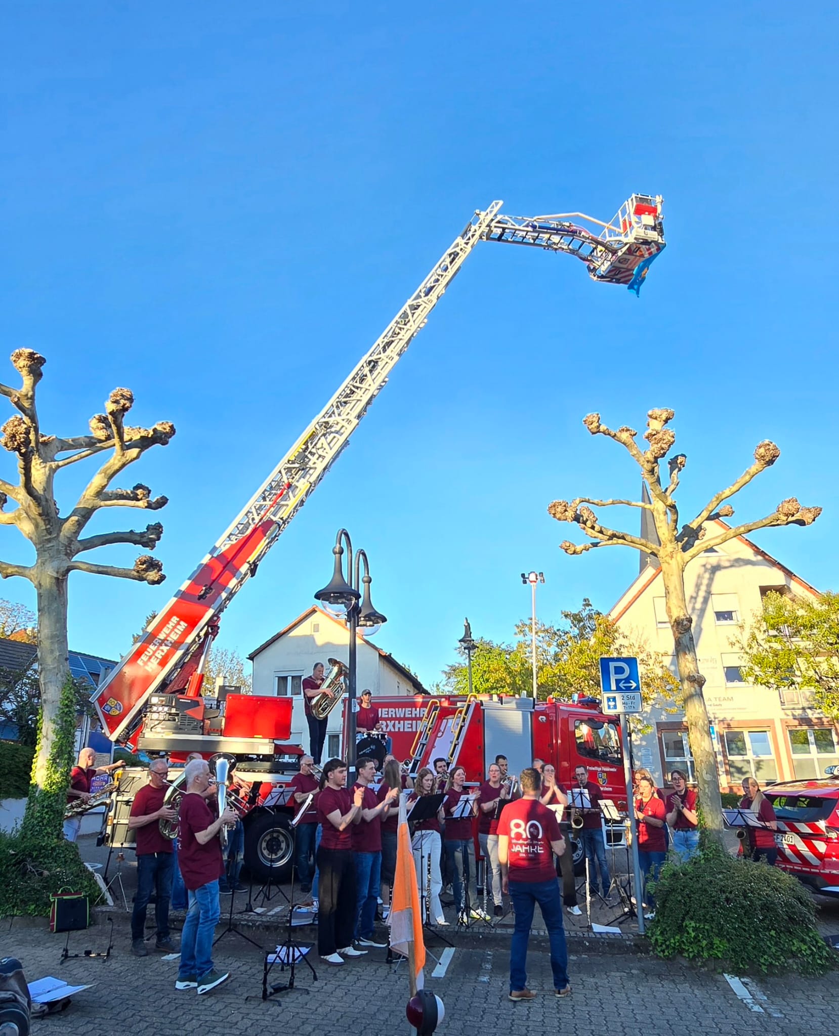 Der klassische Bürgerempfang zum Gründungstag am 23. Mai der Verbandsgemeinde Herxheim wurde heuer durch ein neues Format ersetzt – Kommen zum Schauen und Mitmachen. Auf dem Parkplatz zeigten Bauhof und Feuerwehr eine Fahrzeugschau mit Kehrmaschine, Unimog und Drehleiter. Im Rathaus stellten sich Verbandsgemeinderat, Beigeordnete und Mitarbeitende vor und standen für offene, persönliche Gespräche und Informationen bereit. Im Bühnenprogramm sorgten u. a. die Kultuskapelle Hayna anlässlich ihres 80. Geburtstages für Abwechslung. Gleich viermal spielten die Haynaer: Zur offiziellen Eröffnung im Ratssaal, anschließend für die Kinder Auszüge aus dem anstehenden Konzert „Musikmäuse“ im Juni und zum Abschluss der „Verbandsgemeinde-Party“ gleich zweimal – wieder im Ratssaal mit einem kleinen Platzkonzert und auf speziellen Wunsch der Feuerwehrleute „Die Fischerin vom Bodensee“ draußen neben dem neuen Feuerwehrauto mit Drehleiter. Mit diesem Auftritt startete die Kultuskapelle in ihr 80-jähriges Jubiläumsjahr. Das nächste Highlight im Rahmen der Jubiläumsveranstaltungen ist das traditionelle Waldfest an Pfingsten, gefolgt von einem Kinder- & Jugendtag am 13. Juni 2026.